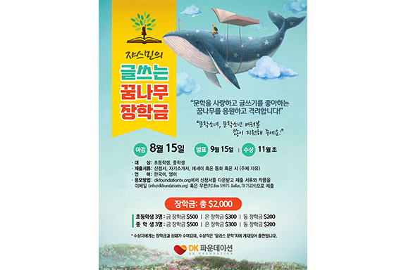 DK 파운데이션에서  “쟈스민의 글쓰는 꿈나무 장학금” 장학생 모집이 시작됐다.