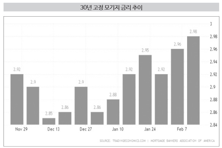 이제 30년 고정 모기지 금리는 지난 11월 이후 최고치로 올랐고 이번주 급등한 미 국채금리를 보면 이번주도 오름 추세는 계속될 것으로 전망된다.