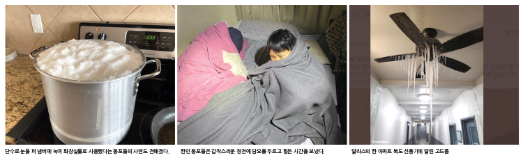 이어 장씨는 “근처 마트에 갔는데, 정전과 함께 식료품들이 동이 났다. 지난해 코로나 19가 시작됐을 때 봤던 사재기를 보는 것 같았다. 텍사스에서 한파 피해를 당할 줄 생각도 못했다”라고 말했다.