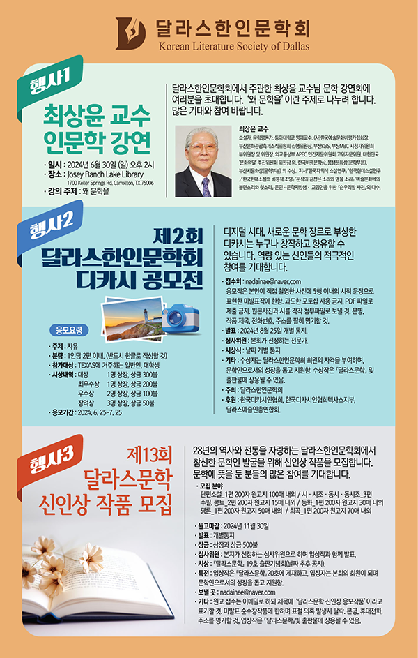 달라스 한인문학회 박인애 회장은 “달라스 지역 동포들이 함께할 수 있는 인문학 강연회 자리를 마련했다”라며, “문학에 관심 있는 사람이라면 누구나 참석 가능하다”라고 전했다.