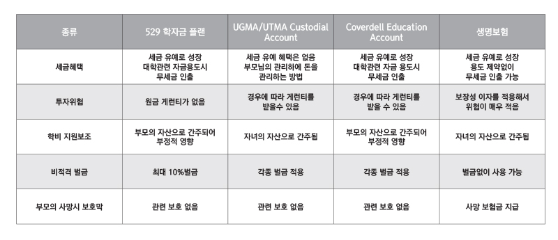 두 번째는 투자 위험이다. 529 플랜 등 대부분의 학자금 플랜은 뮤추얼 펀드나 주식시장에 직접 투자되는 경우가 대부분이다. 하지만 보험회사에서 정해주는 보장성 이자를 적용해서 위험부담을 줄일 수도 있다.