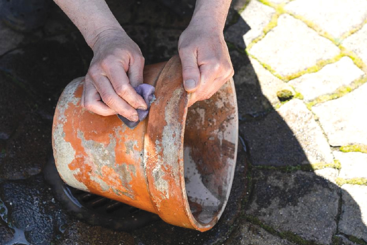 화분을 청소하기에 가장 좋은 시기는 새로운 계절이 시작되는 즈음이다. 더러운 화분은 정원에 큰 피해를 줄 수 있는 해충, 박테리아 그리고 곰팡이를 함유하고 있을 수 있기 때문에 철저히 청소하는 것이 중요하다. 먼저 싱크대나 큰 용기에 표백제를 넣고 물을 부어 희석해 살균제를 만들자. 그러고 나서 살균제를 묻힌 솔로 화분에 남은 마른 흙과 잔해를 문질러 닦은 후 햇볕에 말려 두자.