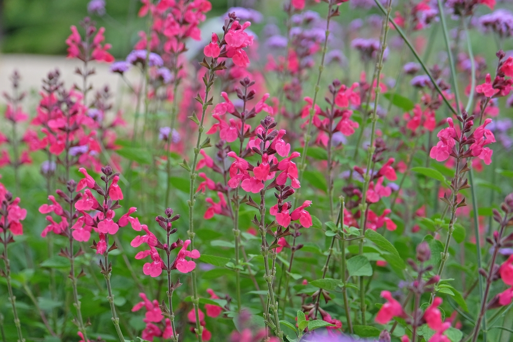 세이지로도 불리는 살비아는 보라색, 흰색, 분홍색 등 다양한 색상의 꽃을 피우며 정원의 색감을 풍부하게 만들어준다. 특히 관 모양의 꽃은 벌새가 좋아하는 형태로, 생태적 가치가 높은 식물이다.