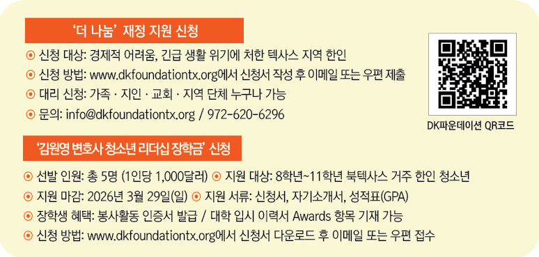 ‘더 나눔’ 재정 지원은 경제적 어려움, 긴급 생활 위기, 사회 복귀 등 새로운 시작이 필요한 북텍사스 지역 한인이라면 누구나 신청할 수 있다. 이번 사례처럼 본인 신청은 물론, 주변에서 도움이 필요한 이웃을 추천해 대리 신청하는 것도 가능하다.