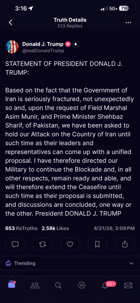 트럼프 대통령은 군에 봉쇄(Blockade)를 계속 유지하고 언제든 공격 준비 태세를 갖추도록 지시했다고 덧붙였다. 휴전은 이란 측의 협상안이 제출되고 논의가 마무리될 때까지 유지된다.