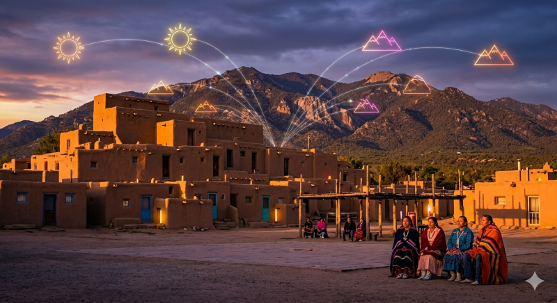 타오스 푸에블로에서 시간이 수백 년을 흘러온 그들의 역사 만큼이나 빨리 흘러갑니다. 벌써 태양이 중천을 넘어 뉘역 뉘역 끝을 알 수 없는 뉴멕시코의 서쪽 대 평원 사이로 빨려 들어가고 있습니다. 그들이 말을 타고 달리며 대 평원을 호령할 때도 태양은 이렇게 흘렀으리라. 아마도 이들이 이곳을 ‘태양의 춤추는 땅’이라고 불렀던 것도 내가 이곳에서 바라보는 저 태양의 화려한 햇살에 그들과 나의 생각을 일치시켰으리라. 그들이 말했던 그 유명한 햇살이 오늘은 더 유난히 빛나고 있습니다.