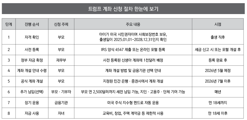 트럼프 계좌는 트럼프 대통령의 세제 개편 법안에 포함된 조항으로, 일정 요건을 충족한 신생아에게 연방정부가 1천달러를 지급해 주식시장에 투자하도록 설계된 제도다. 부모가 계좌를 개설하면 정부가 초기 자금을 넣고, 이후 민간 금융사가 이를 운용한다. 아이는 만 18세가 될 때까지 원칙적으로 자금을 인출할 수 없다.