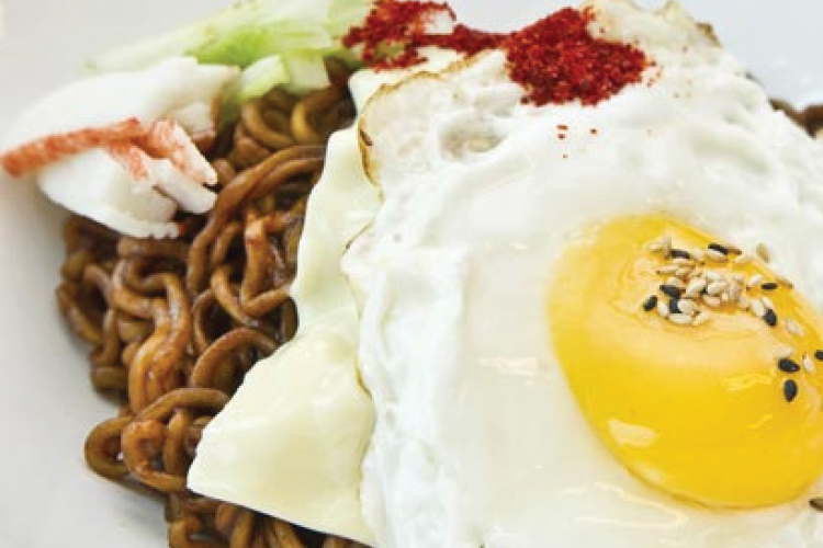 4. 고춧가루와 깨, 어린싹 채소를 얹어 마무리한다. 짜장 라면은 달걀 반숙과 잘 어울린다. 노른자를 터뜨려 함께 비벼 먹을 수 있도록 달걀은 반숙으로 부치는 것이 좋다.