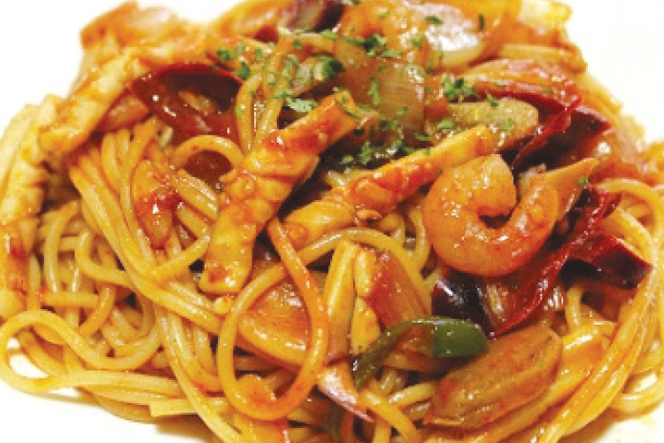 재료: 스파게티 면 2인분, 양파 반 개, 청양고추 1개, 건고추 1개, 마늘 4톨, 오징어 반 마리, 칵테일 새우 10개, 후추, 오일 3스푼, 고춧가루 1스푼, 육수 100ml, 굴 소스 1스푼, 케첩 1스푼, 소금, 생강 약간 (스푼은 밥 수저 기준)