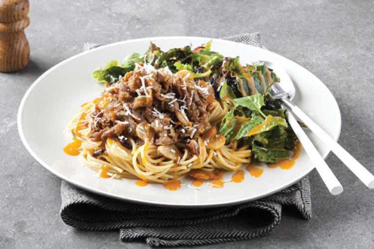 재료: 스파게티 120g, 올리브유 3 큰 술, 마늘 7쪽, 페페론치노 5개, 차돌박이 250g, 샐러드 채소 150g, 파마산 치즈가루