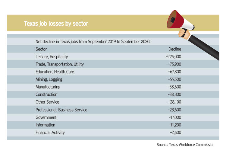 지난해 텍사스는 60만여 개의 비농업 부문 일자리를 잃었고 모든 부문에서 근로자들의 수가 1년 전보다 더 감소했다. 팬데믹 이전에 일자리 성장이 활발했던 금융 활동과 전문 및 사업 서비스 부문을 포함해서 말이다. TWC에 따르면 주정부 일자리도 1만 7천 개나 줄어들었다.