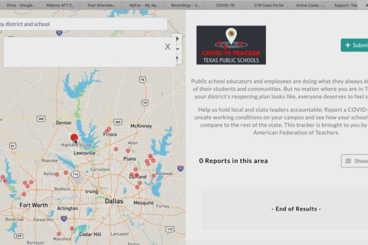 최근 전미교원연맹 AFT가 교육구 별 코로나 19 확진 상황을 파악해 보고하는 새 시스템을 구축한 가운데 텍사스 AFT도 교직원들과 학부모가 코로나 19 관련 데이터를 찾아 보고 코로나 19 확진 상황과 안전이 우려되는 사안들을 직접 볼 수있도록 하는 시스템을 곧 운영할 것으로 알려졌다.