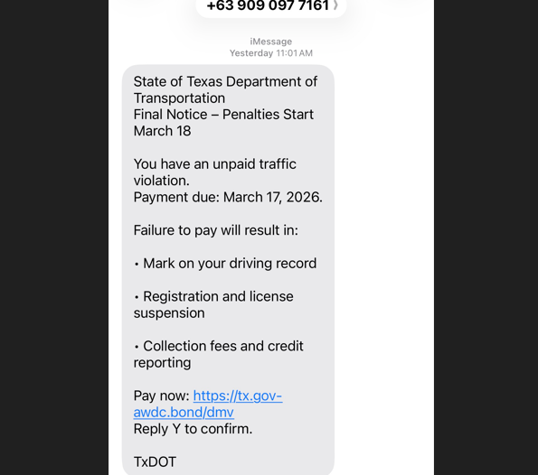 TxDMV 대변인 크레이튼 루트(Creighton Root)는 “이 문제는 1년 이상 여러 주에 걸쳐 발생하고 있다”고 밝혔다. 텍사스 외에도 미시간, 앨라배마, 로드아일랜드, 노스캐롤라이나 등 전국 각지에서 유사 피해가 보고되고 있다. 텍사카나 경찰서(Texarkana Police Department)도 최근 페이스북을 통해 “복잡하거나 낯선 표현과 즉각적인 행동을 유도하는 긴박한 경고 문구가 포함된 문자를 주의하라”고 당부했다.