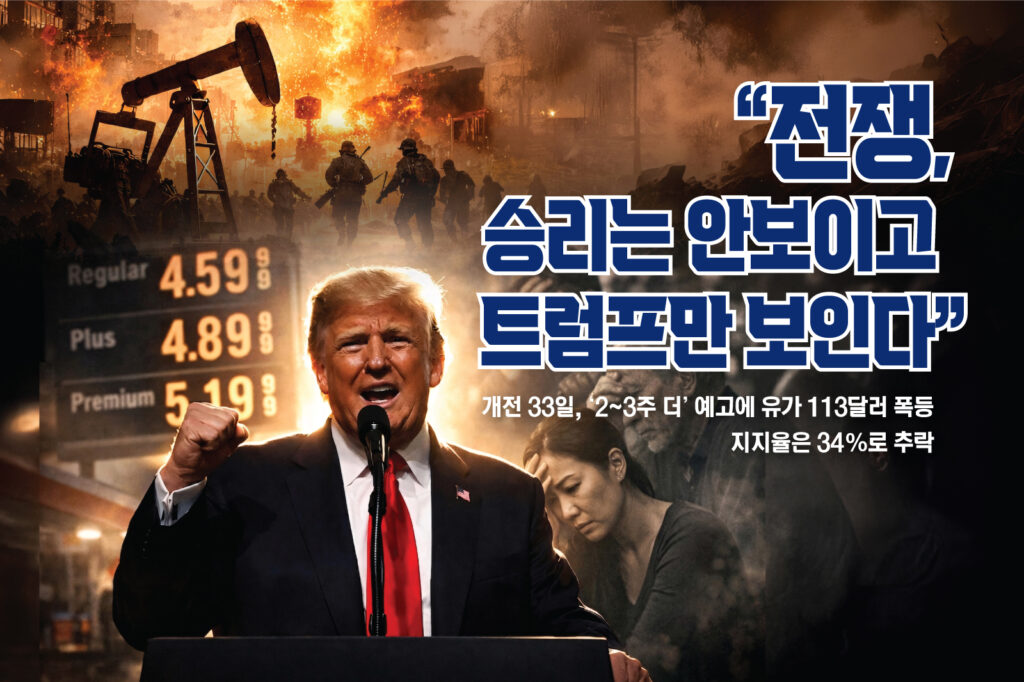 트럼프의 연설은 “종전”이 아닌 “지속”의 선언이었다. 개전 33일 동안 13명의 미군이 전사하고 350여 명이 부상했다. 전쟁의 승패가 어떻게 판가름 나든, 호르무즈 해협이 다시 열리기 전까지 그 비용은 기름값과 물가로 서민들이 먼저 치르게 된다. “2~3주 후”는 이 전쟁의 청구서가 얼마가 될지를 가늠하는 분수령이 될 것이다.