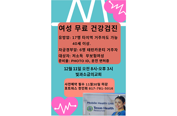 여성 무료 건강검진 행사에 대한 문의는 포트워스 한인회(817-781-5016)를 통해 진행할 수 있다.
