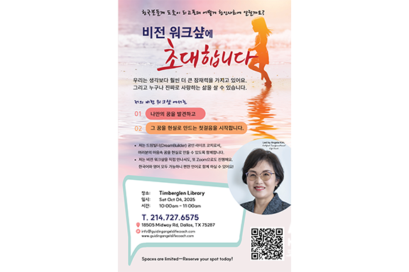 Brave Thinking Institute에서 공인 라이프코치로 인증받은 Angela Kim(한국명 김상림)씨가 비젼 워크샾을 개최한다.