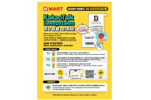 H마트가 달라스 해리하인즈점 오픈을 기념해 고객 감사 이벤트를 실시한다. 이번 ‘구매 영수증 인증 이벤트’는 10월 23일부터 11월 30일까지 진행되며, H마트 달라스 지역 카카오톡 채널을 통해 참여할 수 있다.참여 방법은 간단하다. 카카오톡 검색창에서 ‘H Mar…