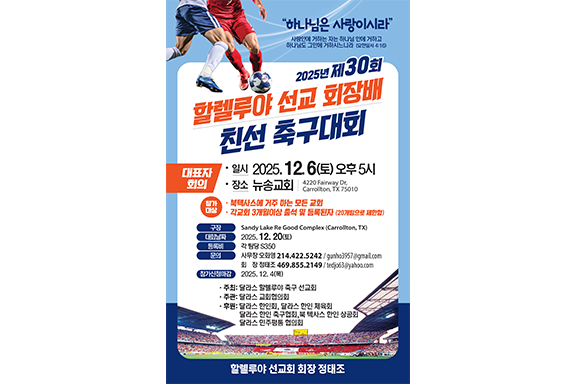 오는 12월 20일(토), 캐롤튼의 샌디 레이크 리굿 컴플렉스(Sandy Lake Re Good Complex)에서 제30회 할렐루야 선교 회장배 친선 축구대회가 열린다. 이번 대회는 달라스 할렐루야 축구 선교회가 주최하고, 달라스 교회협의회가 주관한다.