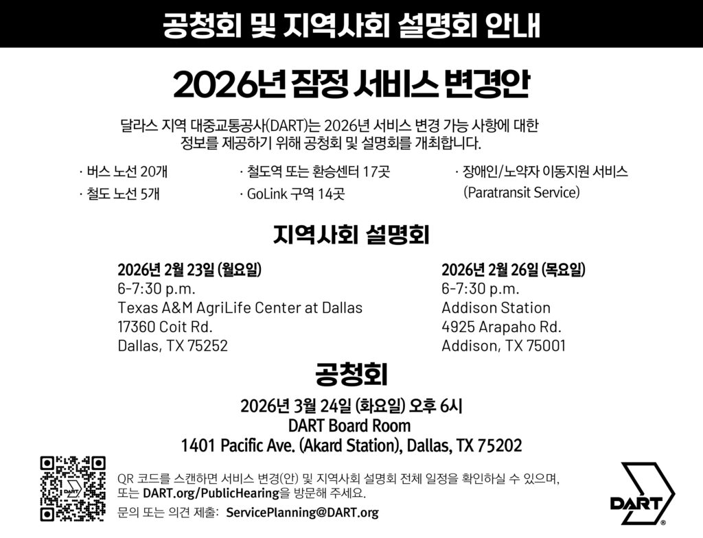 달라스 지역 대중교통공사 DART(Dallas Area Rapid Transit)가 2026년도 잠정 서비스 변경안과 관련해 지역사회 설명회와 공청회를 개최한다.
