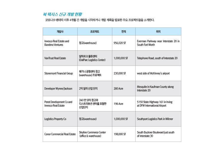 20번 인터스테이트(Interstate 20) 남쪽 달라스 애비뉴(Dallas Avenue)에 들어설 100만sf.규모의 대형 창고형 건물 개발 등 반트러스트 부동산(VanTrust Real Estate)이 계획한 다양한 신규 개발사업들은 이같은 분위기를 잘 반영하고 있다는 평가를 받고 있다.