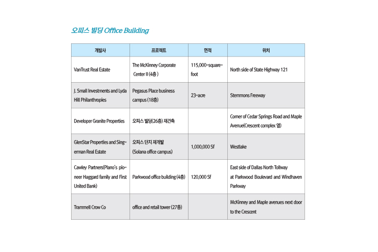 DFW 지역의 이같은 활발한 건설 경기에 대해 개발업자들은 대부분이 코로나19 위기 전에 계획되고 시작된 개발들로써 코로나19로 인한 지역 경제 위기에도 불구하고 지연된 일부 경우를 제외하고는 개발이 중단 없이 진행됐기 때문인 것으로 분석했다.