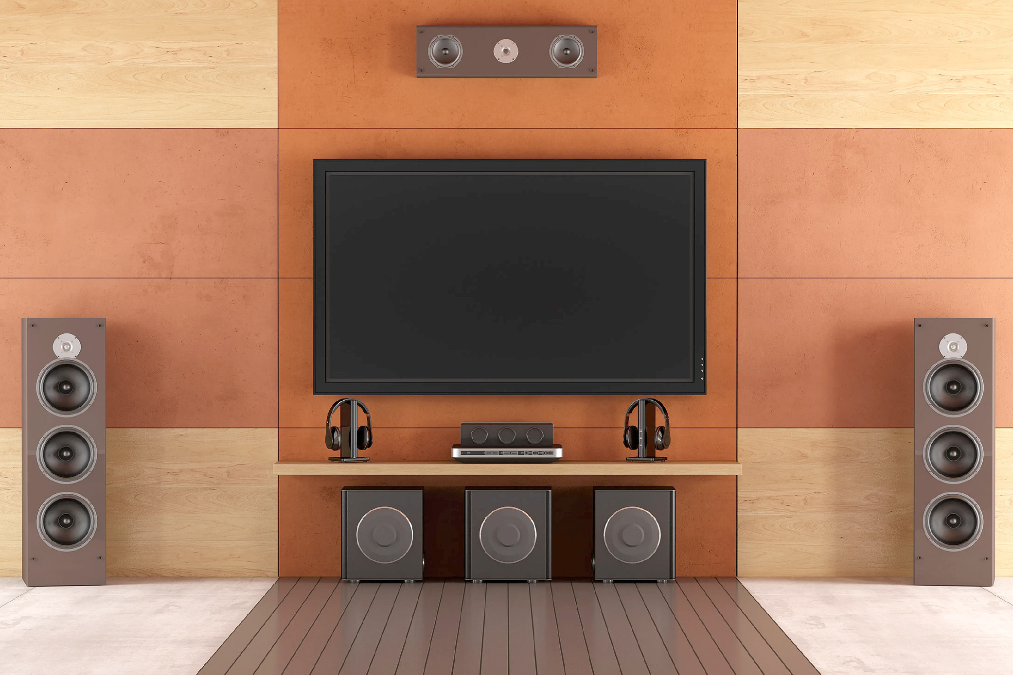 그리고 기본적으로 소스 기기(DVD, 블루레이 플레이어 등), 앰프(AV리시버, AV프로세서), 스피커(또는 사운드바), 디스플레이 장비(TV, 프로젝터 등)로 나누어진다. 소스 기기와 디스플레이 장비는 요즘은 집집마다 하나씩 갖고 있기 때문에 여기서 문제가 되는 것은 결국 영화관과 같은 음향을 재생할 앰프와 스피커라고 할 수 있다.