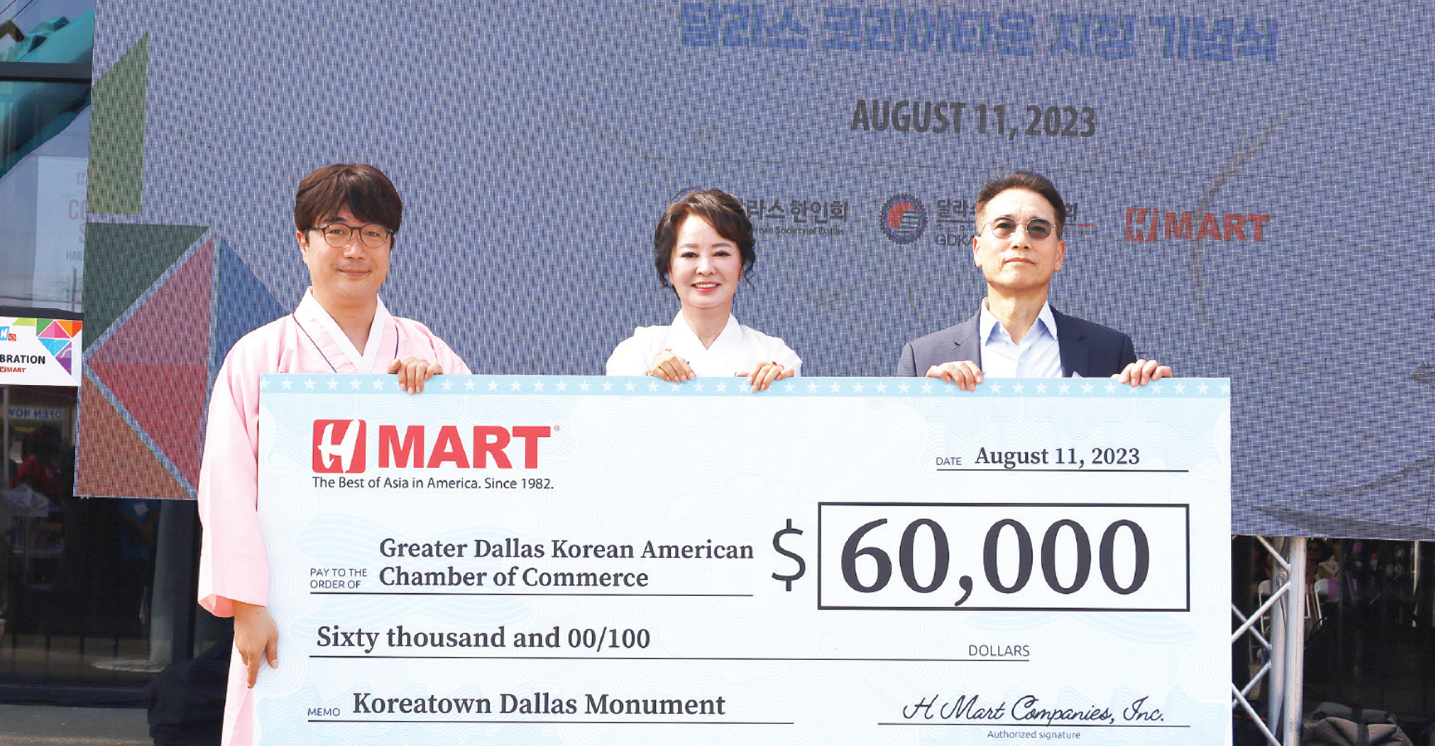 특히 H마트는 이날 달라스 코리아타운 지정 기념비에 사용하도록 무려 6만 달러의 기부금을 전달해 힘을 실었다.