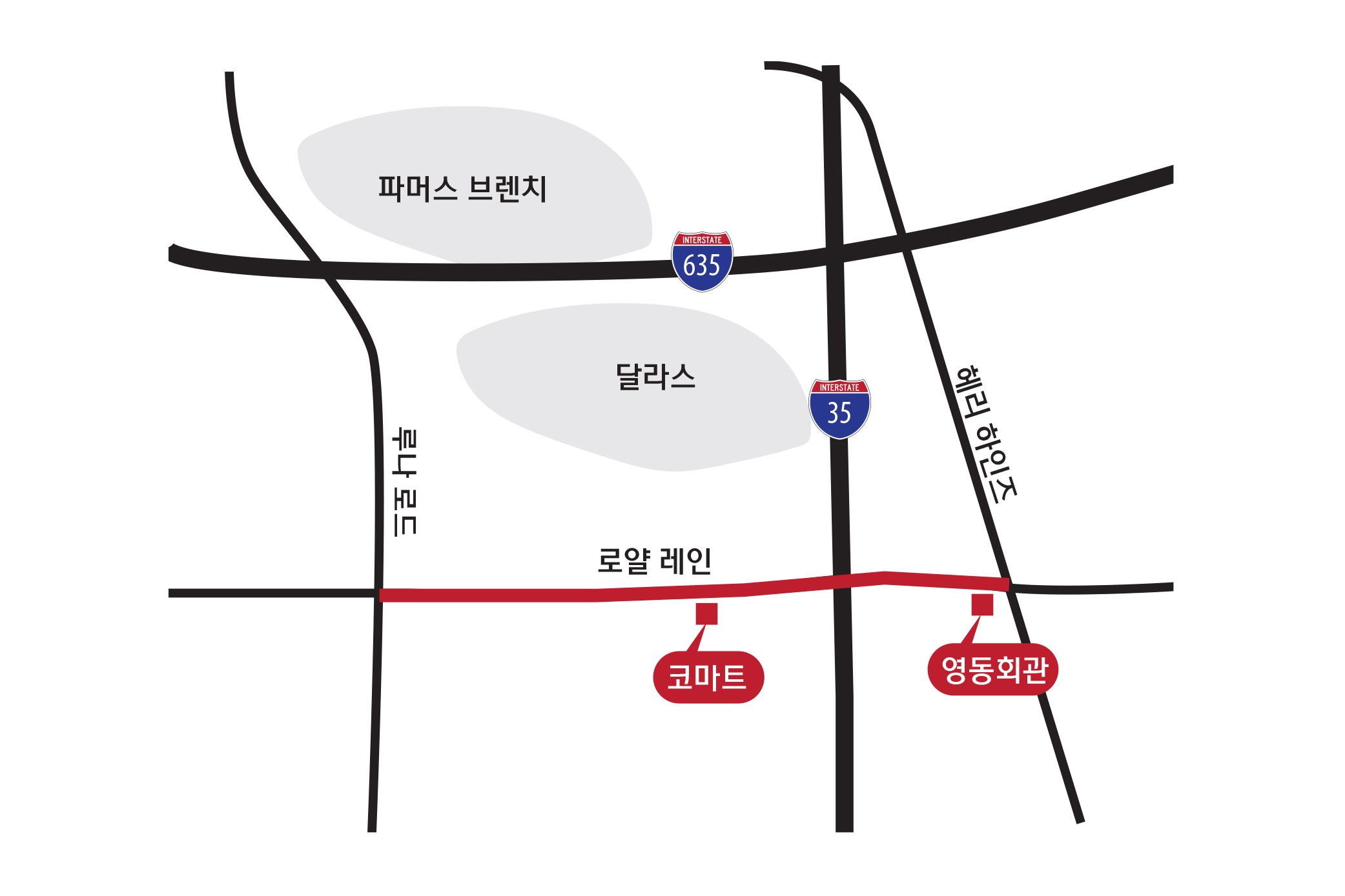 달라스 코리아타운은 해리 하인즈와 로얄 레인이 만나는지점에서 루나 레인까지의 직선도로 약 2.5마일 구간을 일컫는다.