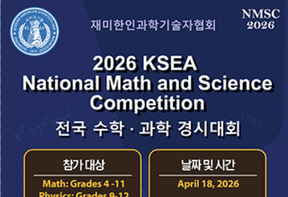 재미한인과학기술자협회(KSEA)가 오는 4월 18일 ‘2026 전국 수학·과학 경시대회(2026 NMSC·National Math and Science Competition)’를 개최한다고 밝혔다.…