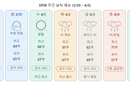 일요일 강수 확률 35%, 기온도 뚝…야외 활동 토요일 추천 이번 주 DFW(달라스·포트워스) 지역은 전반적으로 온화한…