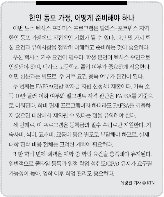 해리슨 켈러(Harrison Keller) UNT 총장은 공식 발표를 통해 “노스 텍사스 최대 대학으로서, 우리 지역과 그 너머까지 교육 기회를 확대할 특별한 책임이 있다”며 “노스 텍사스 프라미스를 통해 더 많은 텍사스 학생들이 잠재력을 온전히 펼칠 수 있는 대학 교육에 접근할 수 있게 될 것”이라고 말했다.